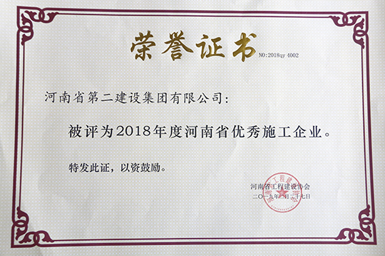 米兰在线手机版(大中国区)荣获“2018年度河南省优秀施工企业”